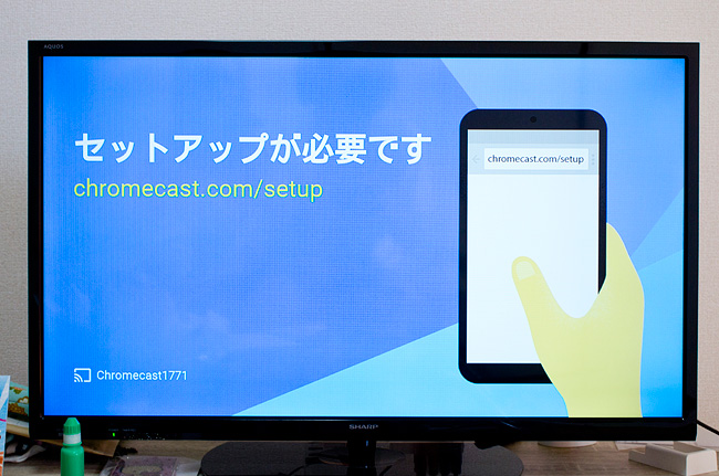 HDMIに接続したら、入力切替でテレビをHDMIに切り替えると、Chromecastの画面が表示されます。